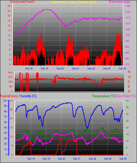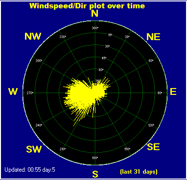 Maximum windspeed = 9.2 mph from 222°( SW) on day 12 at time 19:59